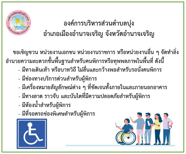 ประชาสัมพันธ์ขอเชิญชวน หน่วยงานเอกชน หน่วยงานราชการ หรือหน่วยงานอื่น ๆ ในพื้นที่ จัดทำสิ่งอำนวยความสะดวกขั้นพื้นฐานสำหรับคนพิการหรือทุพพลภาพในพื้นที่